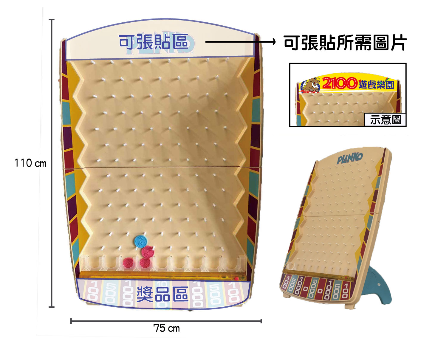 主體:一個垂直的遊戲板,上面佈滿交錯排列的釘子,底部有多個標有不同獎勵(例如:分數、獎金或獎品)的位置(可依照活動需求或獎品名稱替換)。