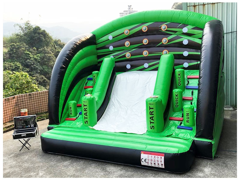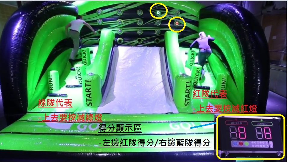 (2)倒數開始後,往前跑向前方亮燈處,準確按下前面燈牆同隊的亮燈號,回到起點再按按鈕可得一分,下位挑戰者照一樣方式進行遊戲挑戰!